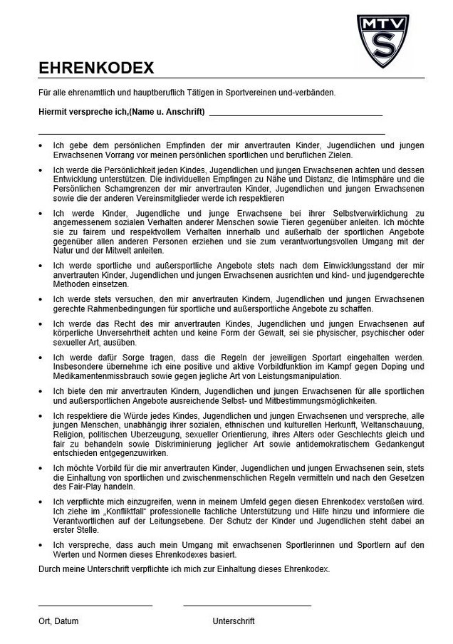 Wir pflegen eine Aufmerksamkeitskultur und bekennen uns zu den Grundsätzen eines umfassenden Kinder- und Jugendschutzes. Dieses muss jeder ehrenamtliche und/oder hauptberufliche Tätige im Sportverein durch den Ehrenkodex mit seiner Unterschrift bestätigen.